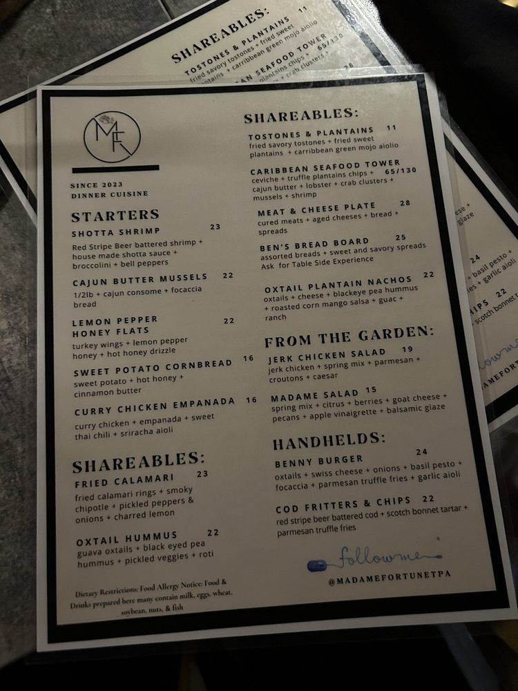 Madame Fortune, a speakeasy and Caribbean-inspired cocktail bar located in Tampa, FL, offers a unique and intimate dining experience. The ambiance is captivating, with a secret entrance and a password for reservations adding to the allure. The menu features flavorful dishes such as oxtail nachos, jerk chicken, and sweet potato cornbread. Customers rave about the impeccable service, with waitstaff like Derrick and Chanel going above and beyond to ensure a memorable dining experience. While some mention slight delays due to understaffing, the overall food quality and ambiance make Madame Fortune a must-visit spot. Don't miss out on the cozy yet classy atmosphere, perfect for a dinner with friends or a late-night hangout. Make sure to try the standout dishes and cocktails, and be prepared to be transported to the exotic flavors of the Caribbean.